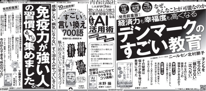 読売新聞全5段広告に掲載された書籍は以下の4冊です。●『経済力も幸福度も高くなる デンマークのすごい教育』(ニールセン北村朋子/著) 新書判